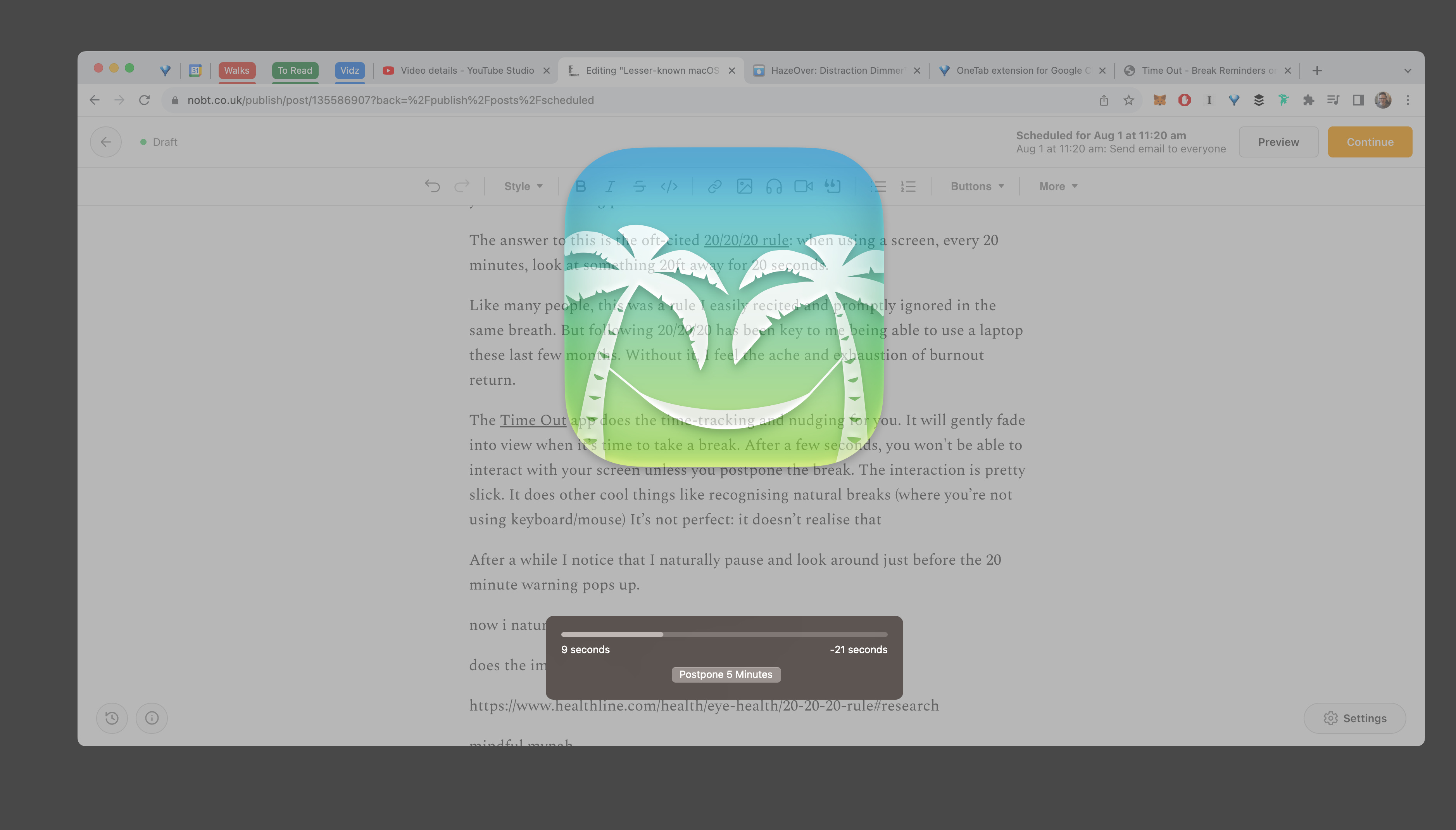 After a month of using this app, I noticed that I started anticipating the breaks: naturally pausing and wondering if I’d accidentally closed the app just before the 20-minute warning pops up.