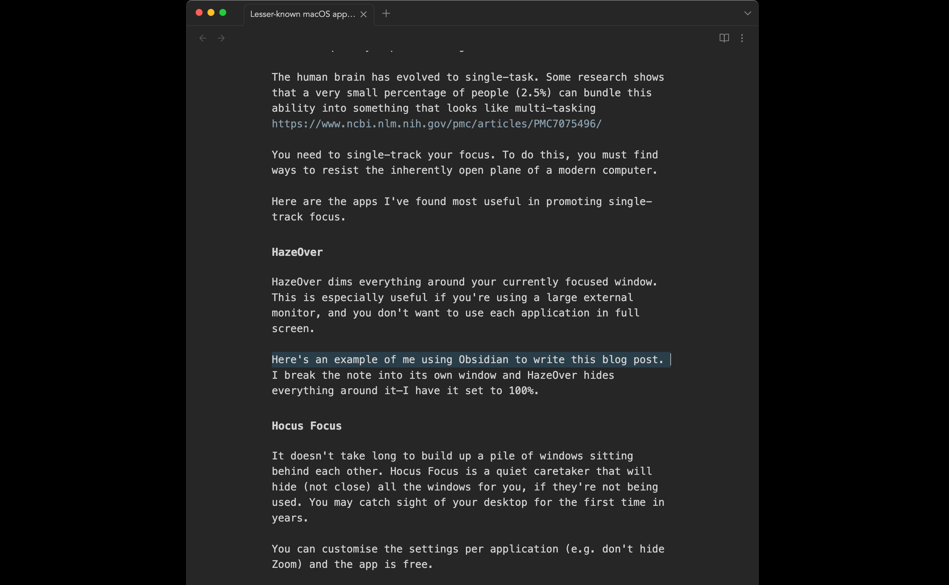 Here's an example of me using Obsidian to write this blog post on a large screen. I break the note into its own window and HazeOver hides everything around it. No desktop, no other windows. The amount of fade is customisable, but I usually go for total blackout.