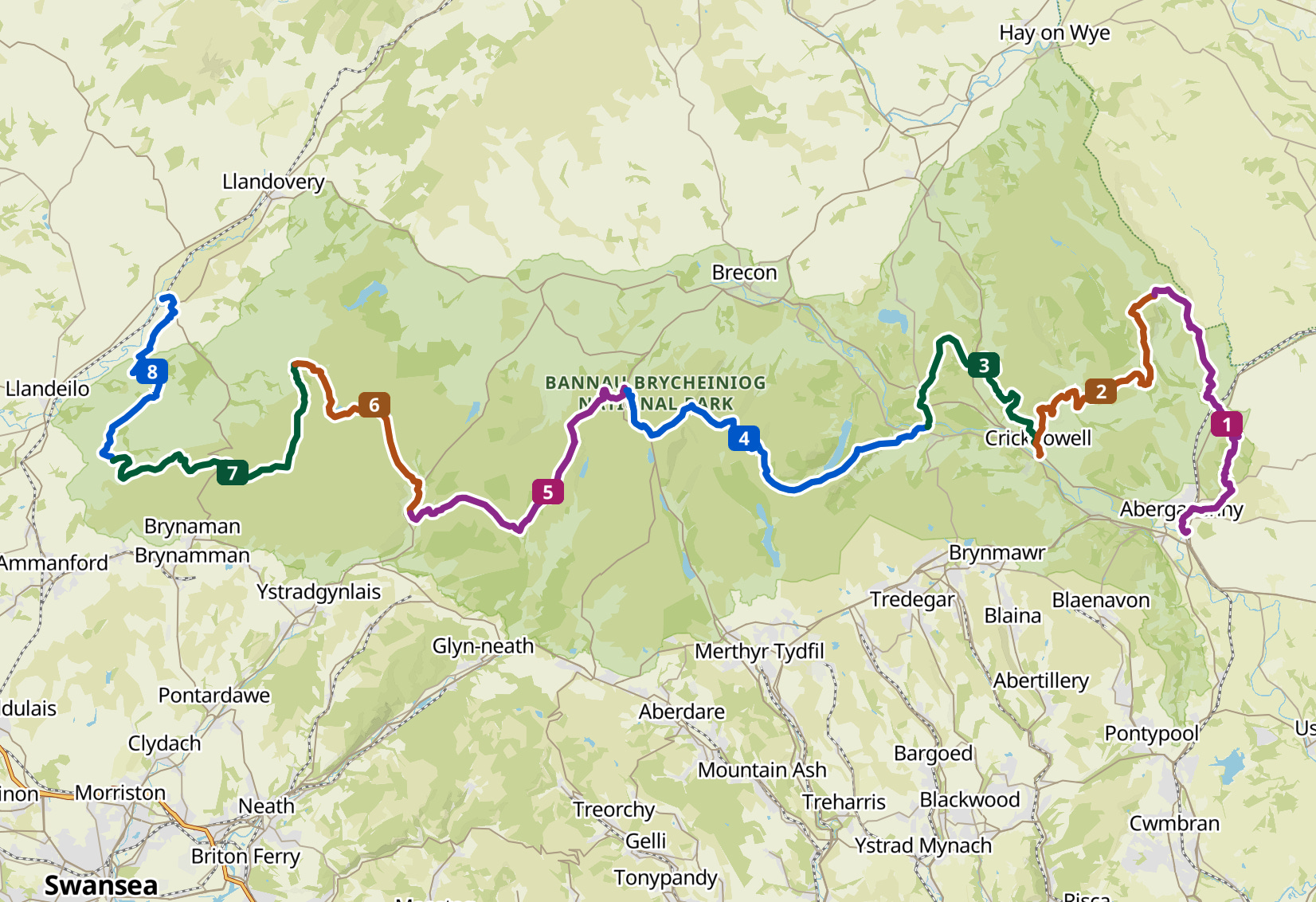 This week, I'm going to be hiking the Beacons Way: a 100-mile trail starting in the East (Abergavenny) and weaving westwards to Llangadog. It will take about 7 days and includes 6,500 metres of gain.